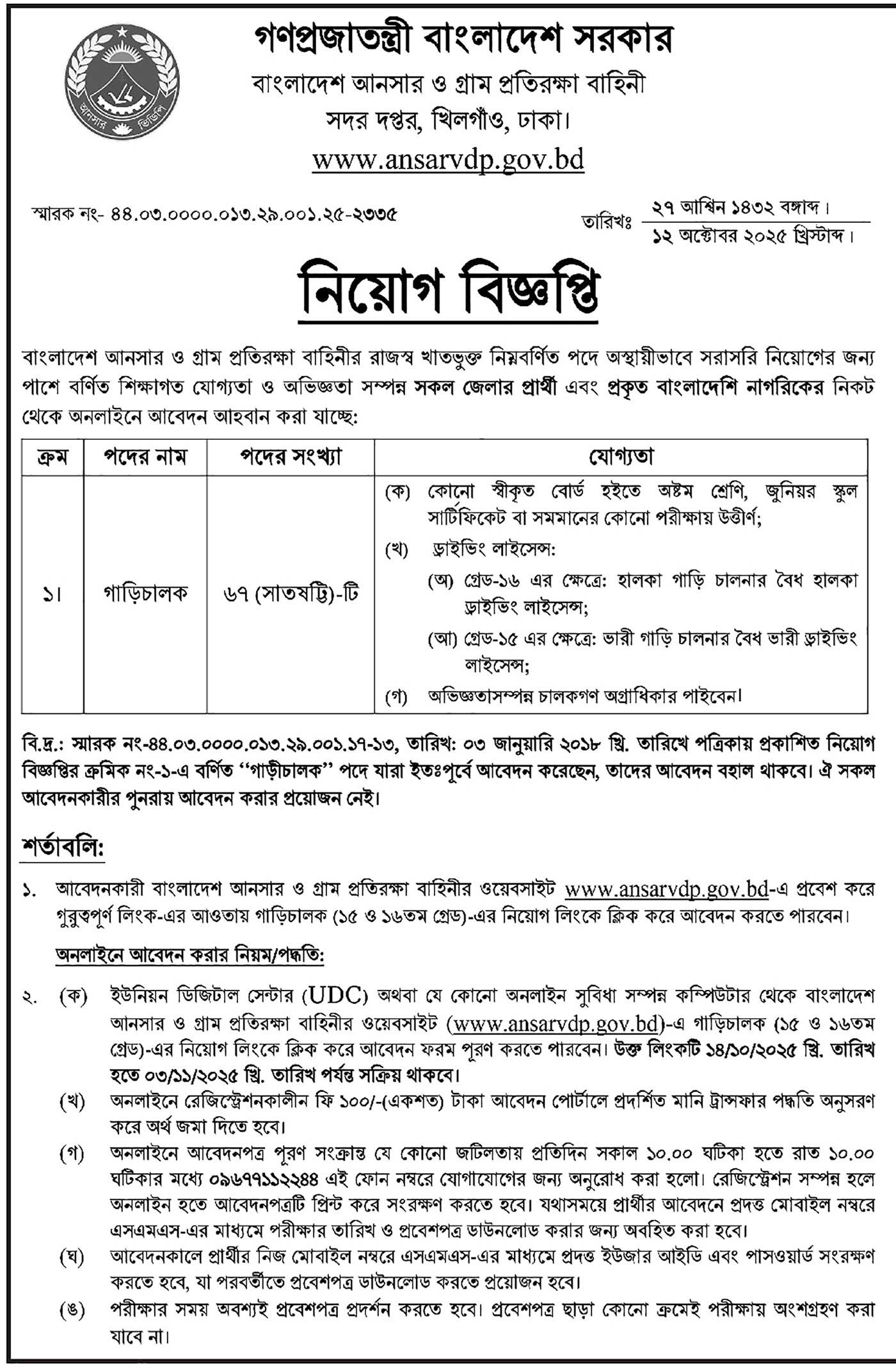 Ansar VDP job circular 2025 has been published on 13 & 29 October 2025 on the daily Ittefaq newspaper and www.ansarvdp.gov.bd. A total of 67+06 people will be hired for 01+03 categories of posts through this Ansar VDP circular 2025. The job application will start on 14 & 29 October 2025 and will end on 03 & 17 November 2025.