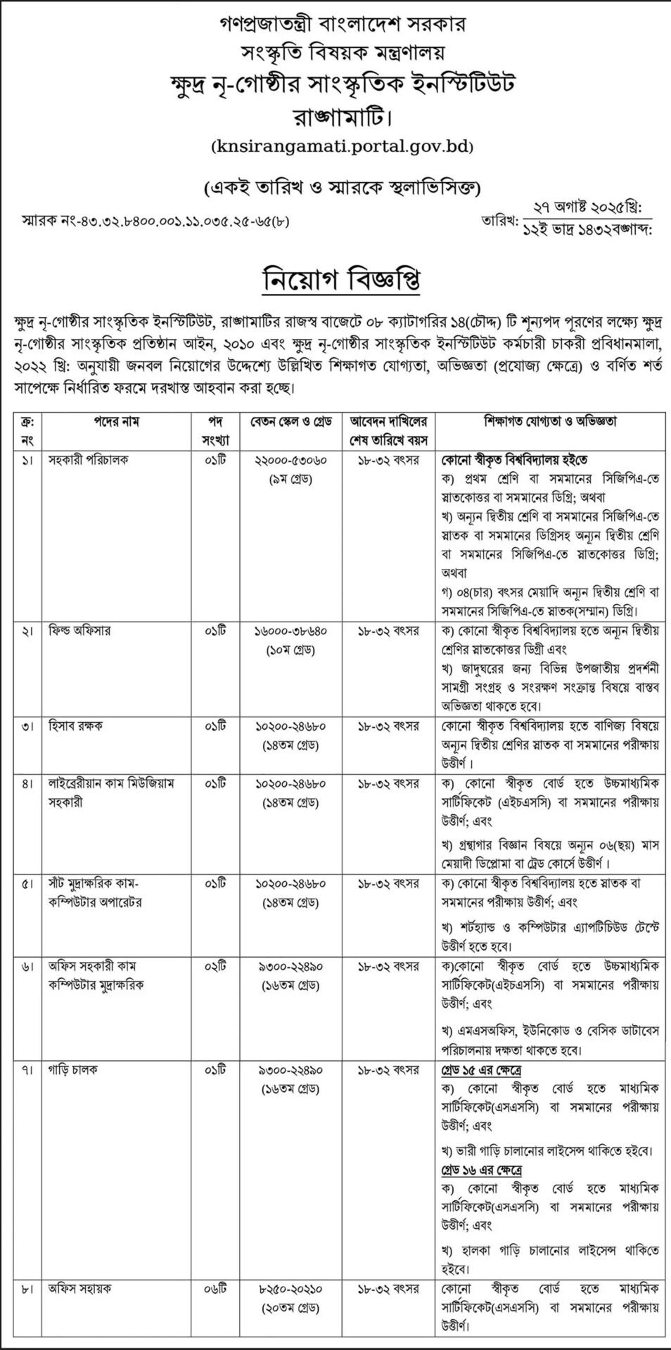 Cultural Institute for Small Ethnic Groups job circular 2025 is one of the best government jobs circular in 2025. Cultural Institute for Small Ethnic Groups has invited applications from genuine Bangladeshi citizens for the www.knsirangamati.gov.bd job circular 2025. Educated eligible men and women from all districts aged 18 to 32 years can apply for Khudra Nrigosthir Sangskritik Institute, Rangamati Job Circular 2025 as per their eligibility.