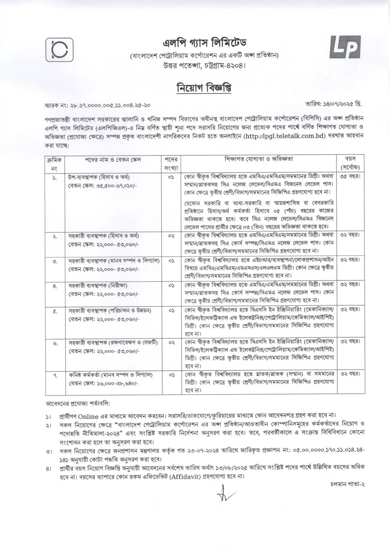 এলপি গ্যাস লিমিটেড নিয়োগ ২০২৫