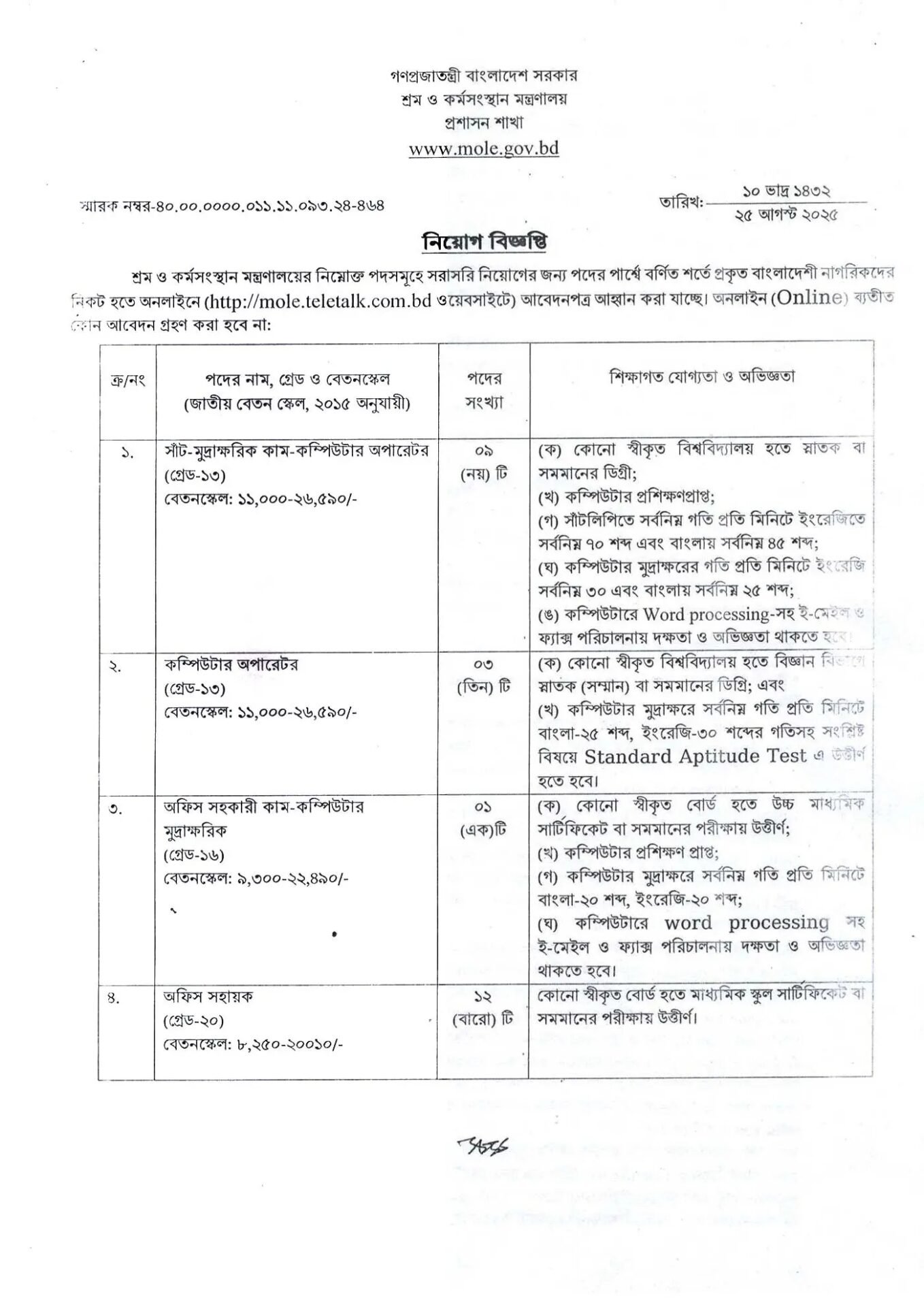 Ministry of Labour and Employment MOLE Job Circular 2025