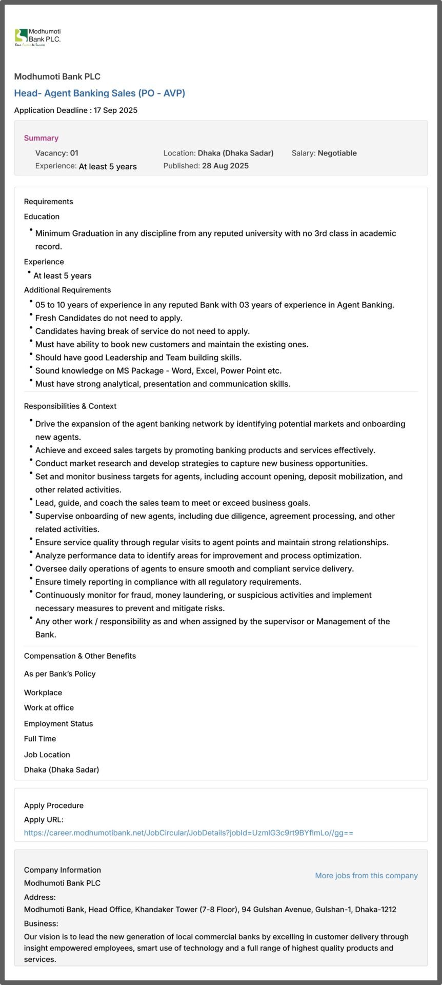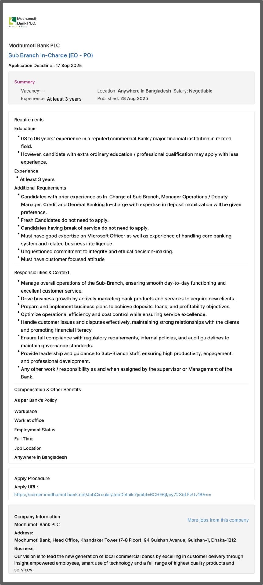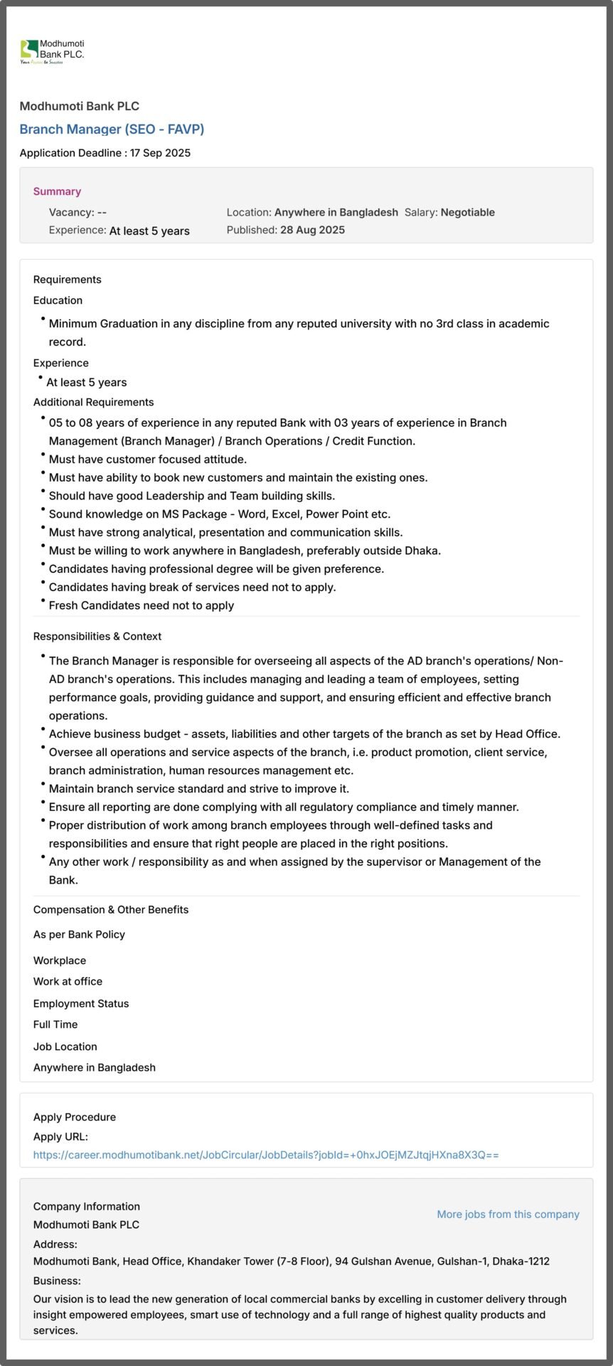 Modhumoti Bank PLC is one of the trusted and well reputed bank in Bangladesh. The Modhumoti Bank PLC swift code is MODHBDDH. Modhumoti Bank head office is located at Khandker Tower, (Level-7 & 8), 94, Gulshan Avenue, Gulshan-1, Dhaka-1212. Recently, they have been looking for new manpower. So, Modhumoti Bank Limited has published this new job circular in 2025 to add the right qualified job candidates.