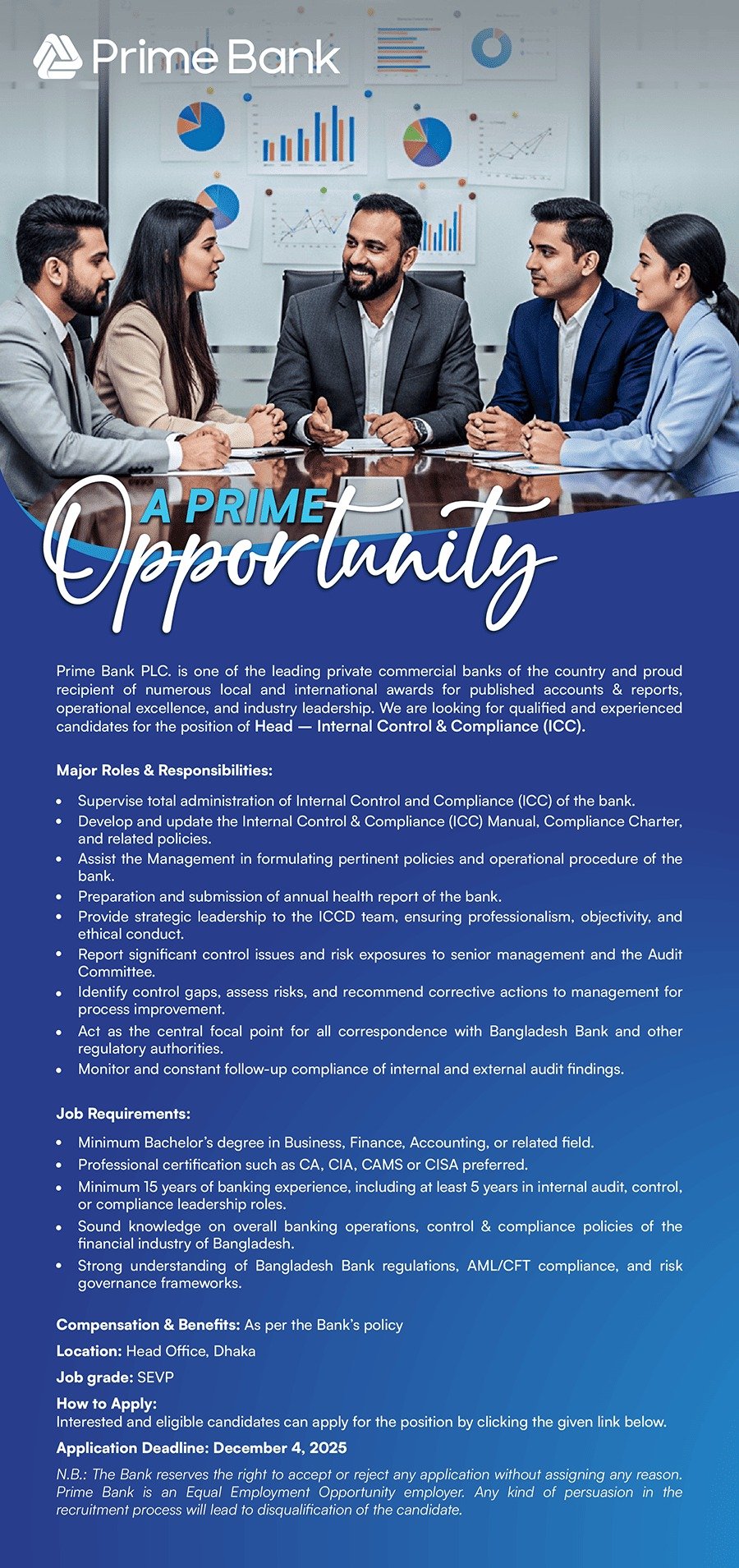 Prime Bank Job Circular 2025 has been officially published on 20 November 2025 in the bdjobs website. According to the circular, Prime Bank PLC will appoint a total of (not specific) people for the 01 job post through this Prime Bank PLC job circular 2025. The last date to apply online is 04 December 2025.