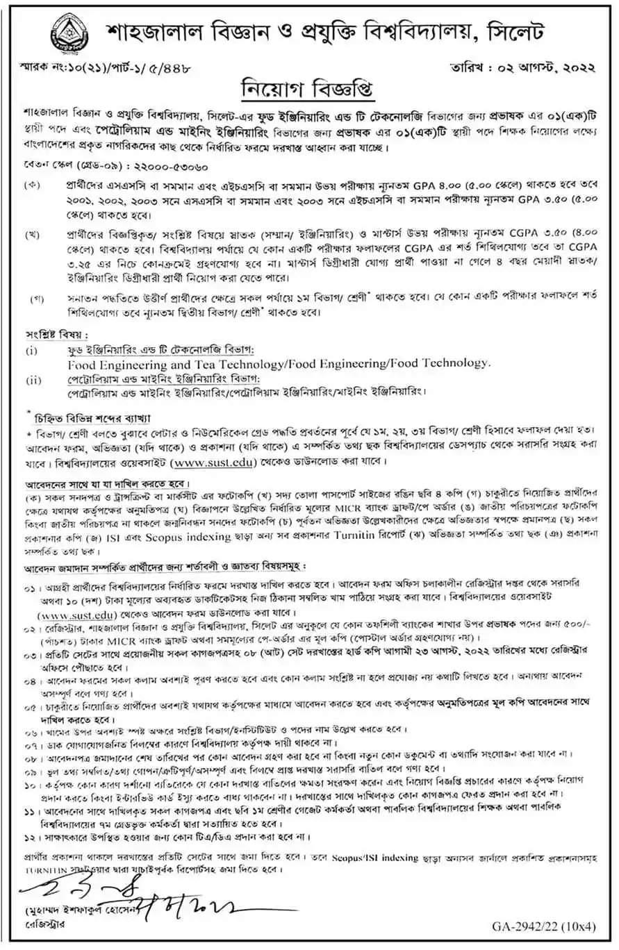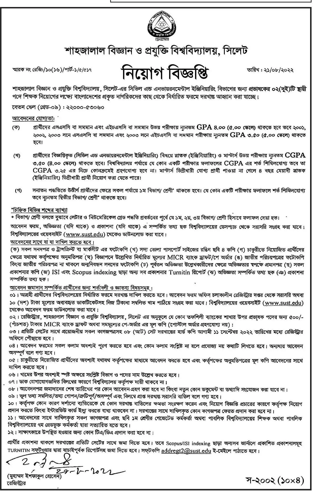Shahjalal University of Science and Technology Job Circular 2022 SUST Job Circular 2022 published on www.sust.edu. SUST Job Circular 2022 offers new University Jobs. New Job Circular of Shahjalal University of Science and Technology Jobs Circular notice is also available on our bd jobs website BD Govt Job Net. SUST Jobs Circular is the most attractive University job circular in Bangladesh. So read this full article about Shahjalal University of Science and Technology Job Circular. Please check which post matches your academic qualification for this Shahjalal University of Science and Technology SUST job circular 2022. Then don’t be late for the Shahjalal University of Science and Technology Job apply. So please check the SUST Job Circular 2022.